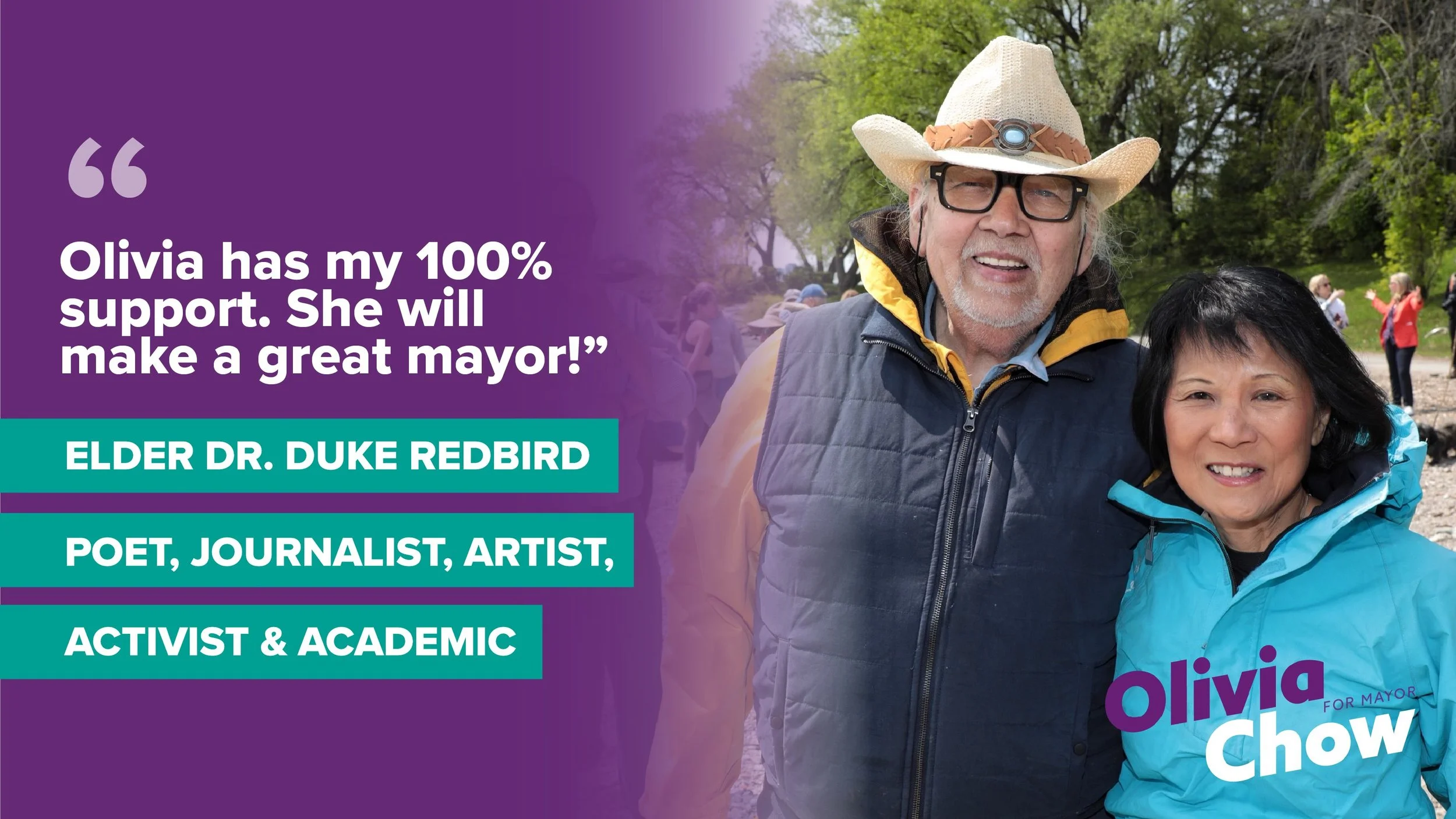Elder Dr. Duke Redbird, from the Saugeen Ojibway Nation, says Olivia has been a friend of First Nations since she was first elected.
